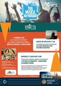 Sabato 20 luglio dalle 17.30 le Grotte di Pastena ospiteranno Alla Magia l’incanto delle note, esibizione del sassofonista Stefano Di Battista all’interno delle grotte. Dopo il percorso, il pubblico, insieme ai tecnici della Regione Lazio, potrà partecipare alla registrazione degli ultrasuoni per il riconoscimento dei pipistrelli, i veri padroni di casa delle grotte, e vivere così un’esperienza di citizen science.