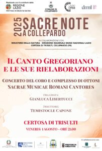 L’iniziativa rientra nel ciclo Sacre Note a Collepardo 2025, parte del Festival di Musica Sacra della Regione Lazio, realizzato con il contributo della Regione Lazio, in collaborazione con LAZIOcrea, il Ministero della Cultura – Direzione Regionale Musei Nazionali Lazio e il Comune di Collepardo.